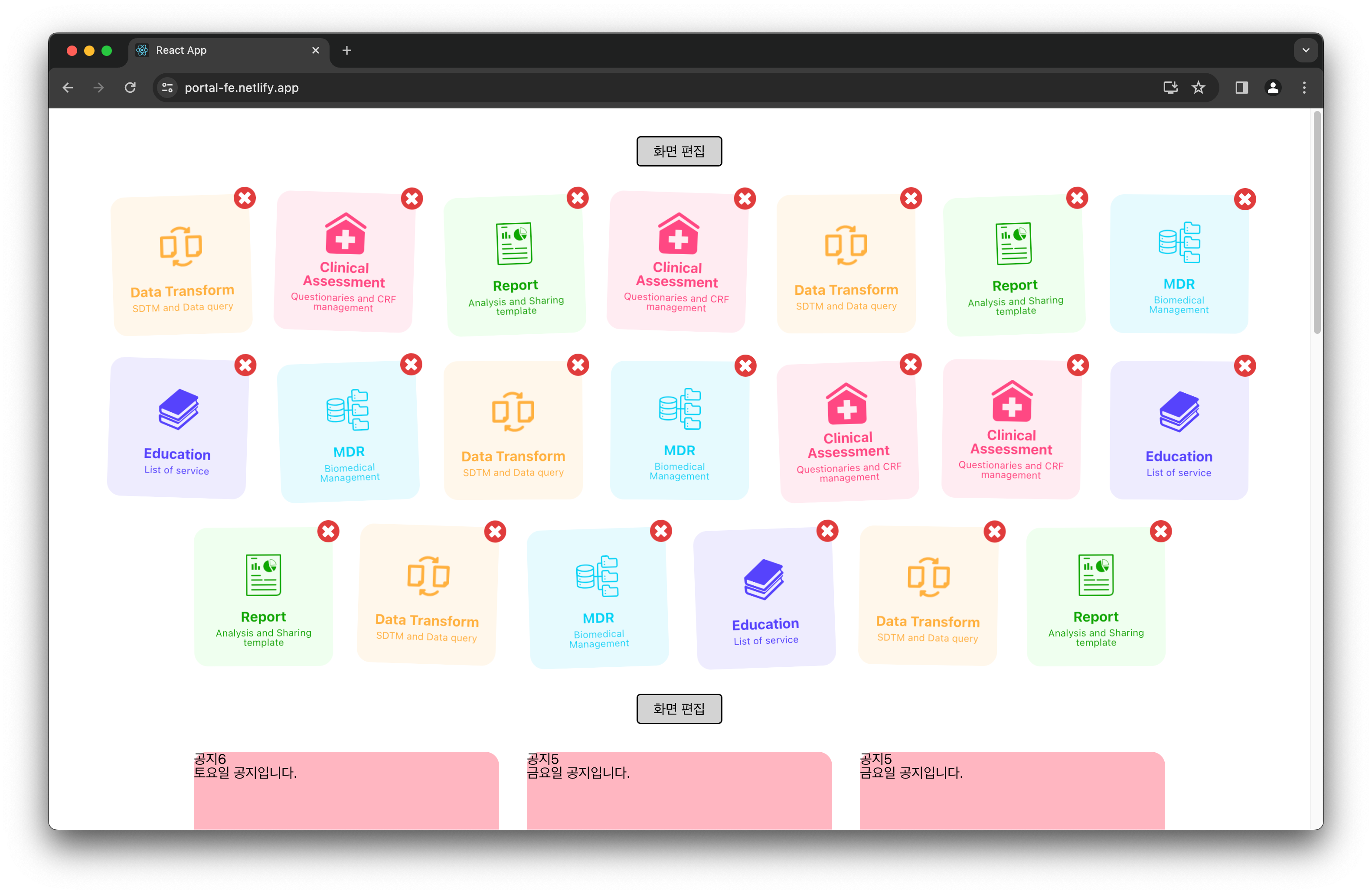 서울대학교병원 전용으로 맞춤 개발하는 차세대 임상시험 전자데이터 수집 시스템(EDC) 개발 팀에 2달간 프론트엔드 개발 지원을 했습니다.